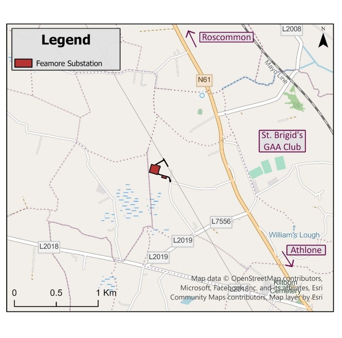 The proposed Feamore 110 kV substation is located in the townland of Moyvannan, Kiltoom, Co. Roscommon. It will facilitate the export of renewable energy from the Seven Hills Wind Farm into the national electricity network.